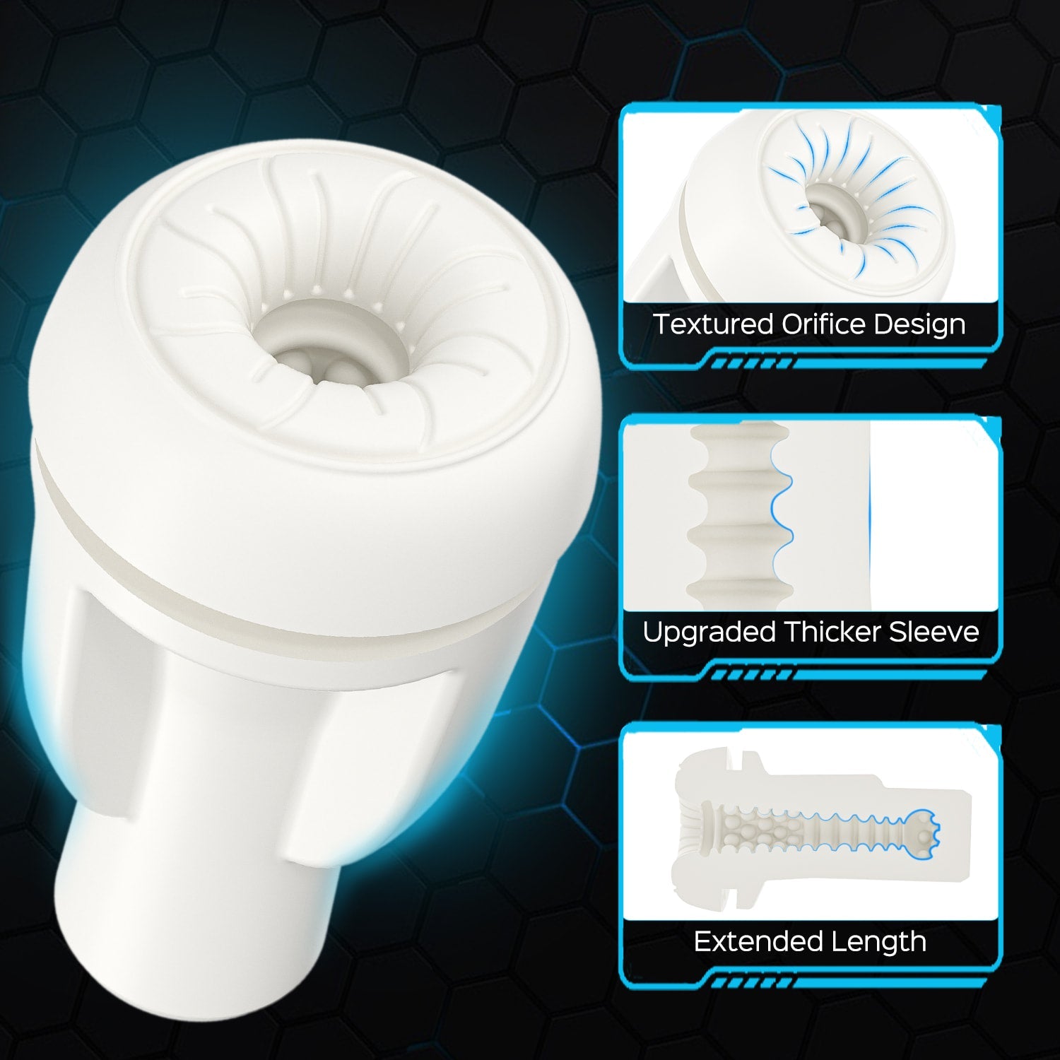 Larger orifice and denser raised beads in thicker sleeve offer targeted penis stimulation. Sleeve stays in place even with strongest suction power.
