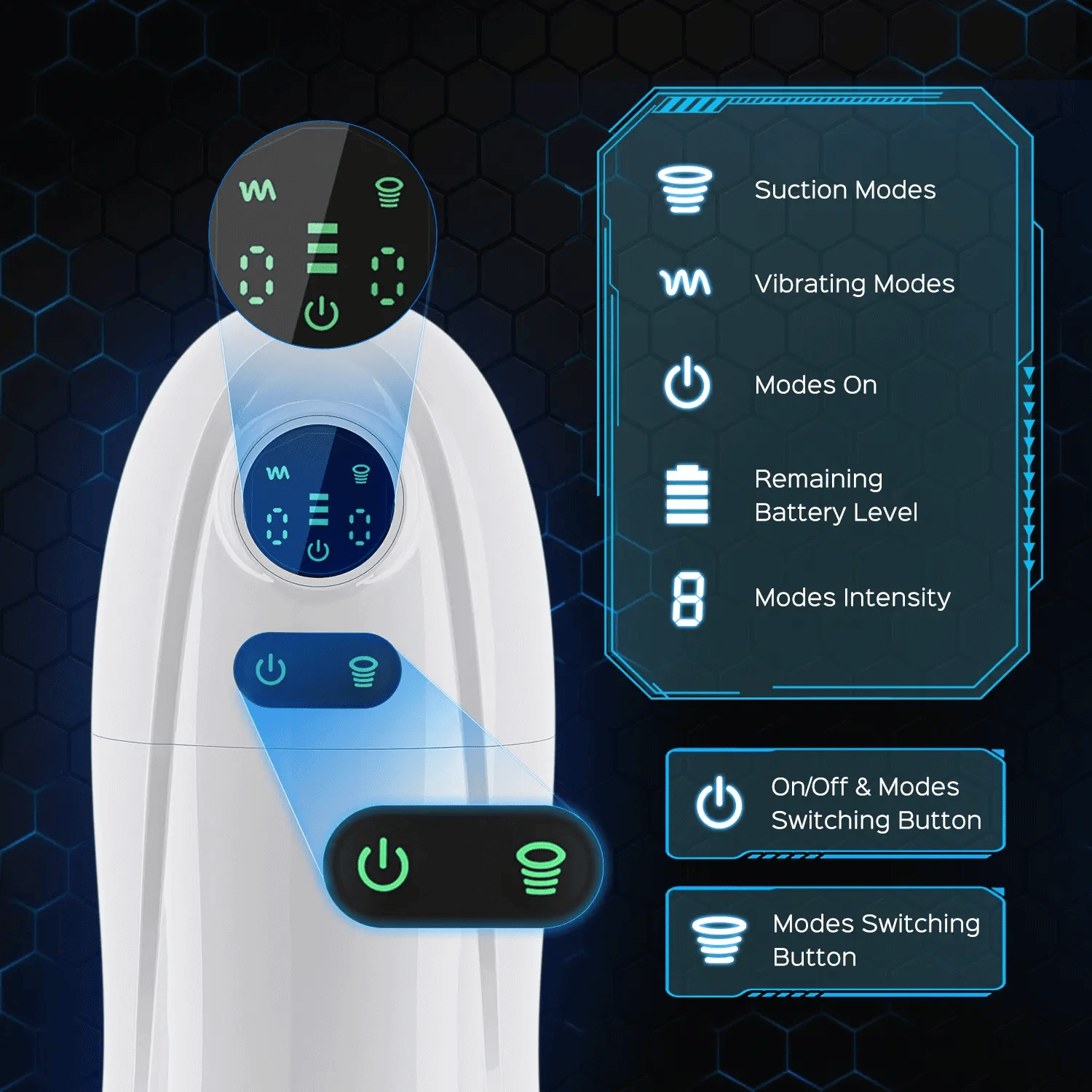 Innovative screen shows vibration and suction intensities plus battery level. Smart heating reaches human-like temperature and helps dry sleeve after cleaning.